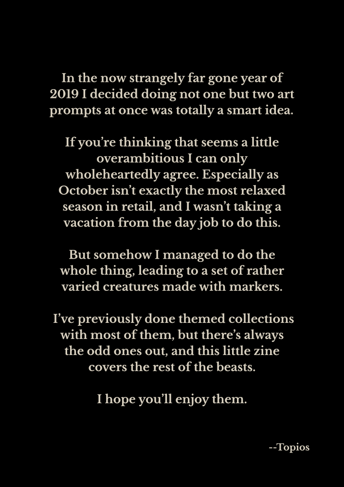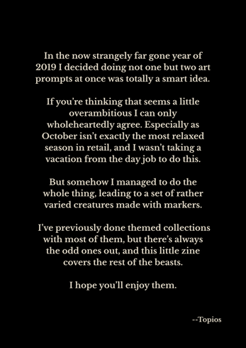 A 20 page Zine with the 8 remaining 2019 art prompt artworks I couldn't fit into a themed set + sketches and notes.